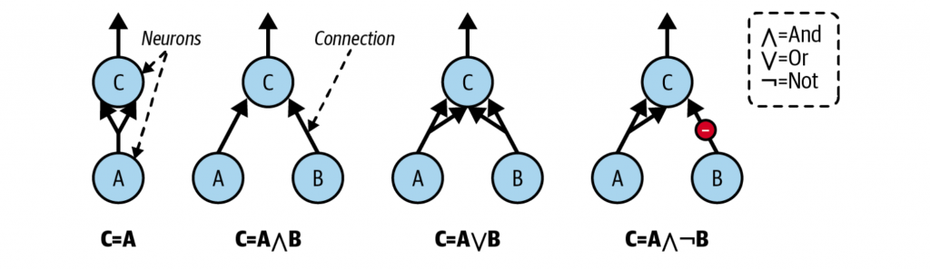 - 第四张图比较特殊,B的边为抑制作用,因此B激活等价于减少了一个输入。因此这里A激活且B关闭才能激活C