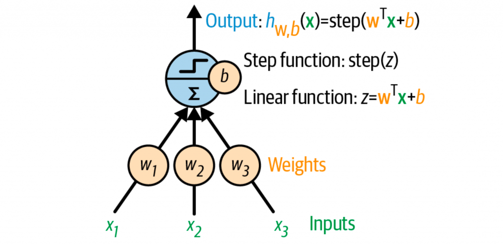 每个输入都会有对应的权重,TLU会先计算线性函数的输出,再根据一个阶越函数(step function)来计算最终的结果。