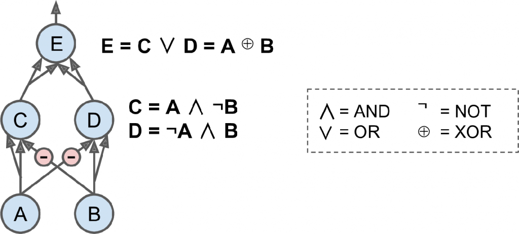 因此通过简单的神经元,可以组装为复杂的逻辑运算。比如逻辑的异或A XOR B,可以通过下图表达出来