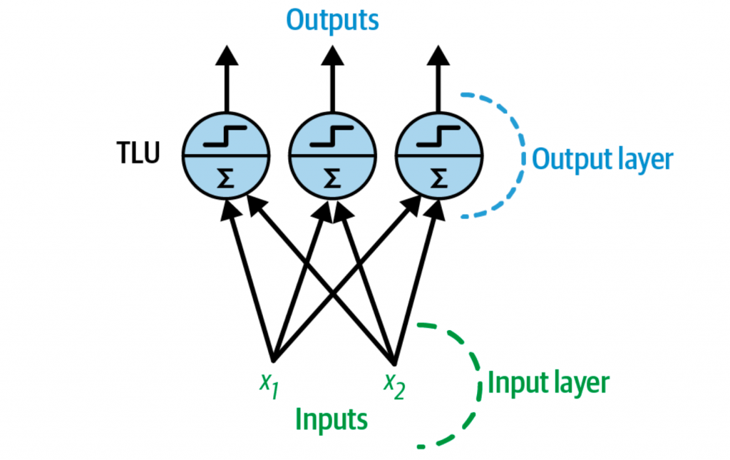 一个感知机在同一层会包含多个TLU,每个TLU就会连接到所有的输入,这种称之为全连接层(fully connected layer),输入组成了输入层(input layer),而TLU的输出组成了输出层(output layer)。
