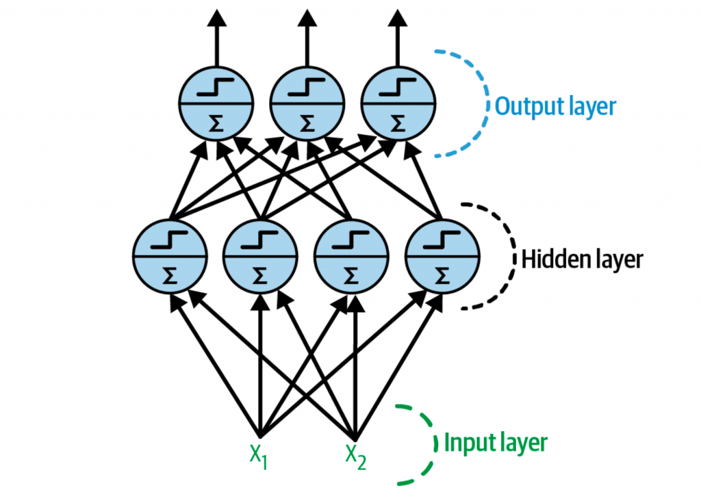 MLP包含1个输入层,1个输出层,而中间会有多层TLU,称为隐藏层(hidden layer)。靠近输入的为lower layer,靠近输出的为upper layer。多层隐藏层堆叠的神经网络,也被称为深度神经网络(deep neuron network,DNN)。