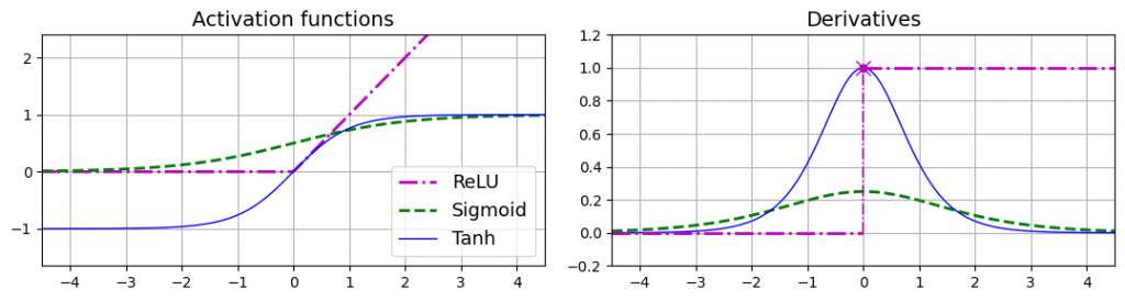 - ReLU函数(The rectified linear unit function),ReLU(z) = max(0, z)。取值为0处是不可导的,小于0时的导数为0。由于计算速度特别快,因此为默认的激活函数。