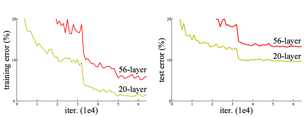 然而,实践发现,当网络深度超过某个点(例如 20 层)后,会遇到一个严峻的问题:更深的网络反而表现更差,如下图所示: