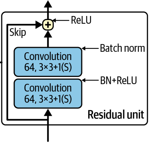 当我们初始化一个常规神经网络时,其权重初始值接近零,因此网络初始输出值也接近于零。但若引入跳跃连接,形成的网络初始阶段会直接复制其输入——换言之,它最初模拟的是恒等函数(identity function)。如果目标函数与恒等函数非常接近(这种情况十分常见,比如在图像去噪中,目标是去除噪声,但干净图像的大部分内容就是输入图像本身),这种机制将显著加速训练过程。