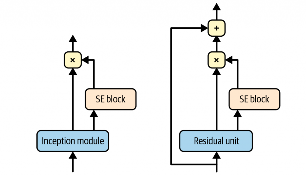 SENet的核心就是SE模块,其具有即插即用的特性,可以嵌入到几乎任何主流的CNN架构中,从而创造出SE-ResNet、SE-Inception等变体,如下图所示
