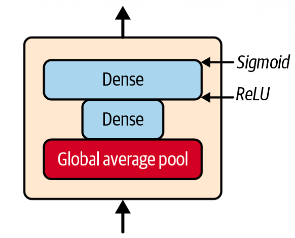 一个SE模块主要有三部分组成,一个全局平均池化层,以及两个全连接层:一个使用ReLU激活函数的隐藏层,一个sigmoid激活函数的输出层。