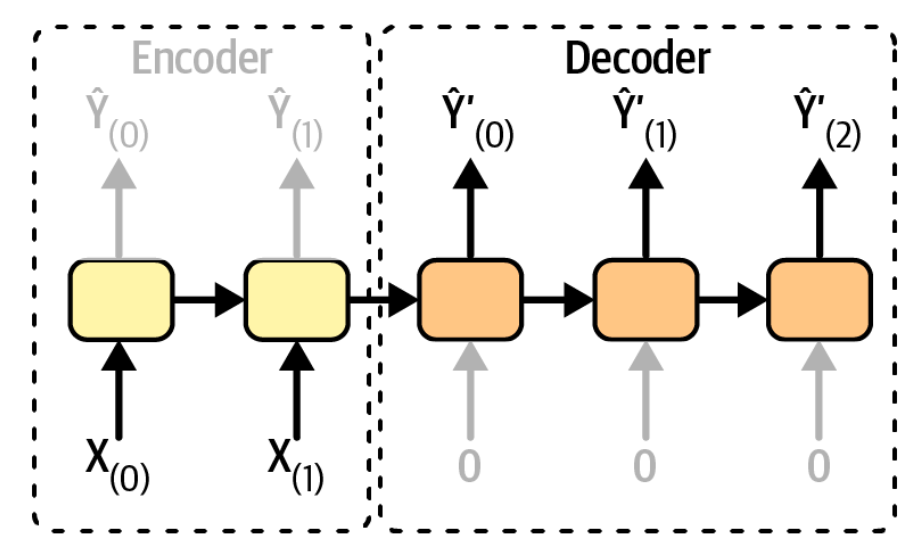 先有一个sequence-to-vector的网络,称为encoder,再接着一个vector-to-sequence的网络,称为decoder。比如翻译的场景,必须等待完整的句子输入后,才能进行翻译并逐词输出。
