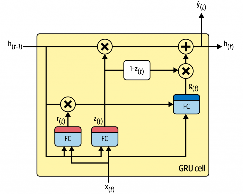 与拥有三个门(遗忘、输入、输出)和一个独立单元状态的LSTM不同,GRU(gated recurrent unit)通过更精简的设计达到了相似的目标。