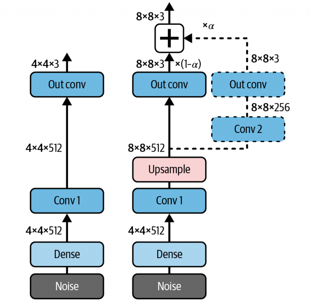 - 渐进增长阶段。上图的右侧部分,向生成器和判别器中添加新的更高分辨率的层,从而产出更高质量的图像。同时,这里通过权重因子