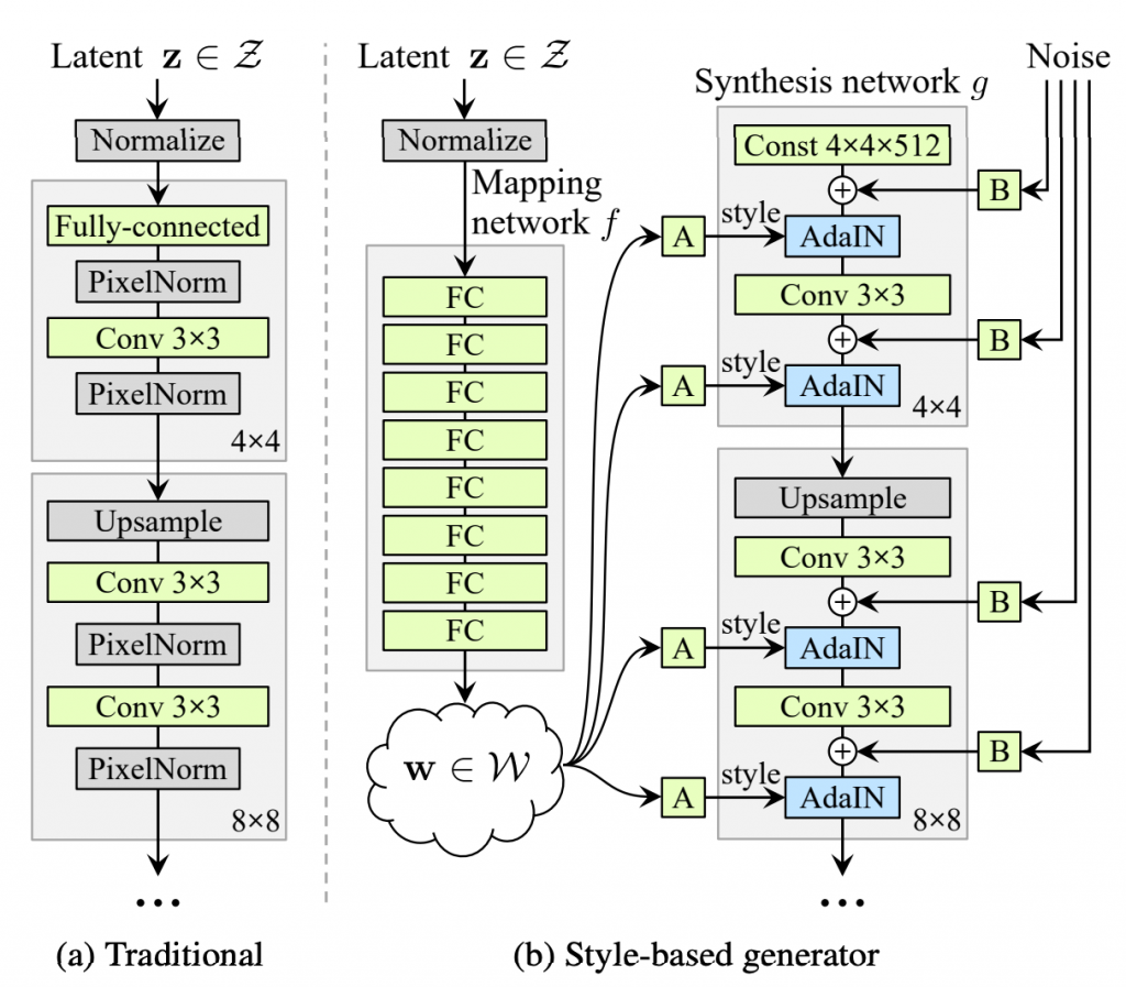 上图就是原论文中的StyleGAN的架构,主要包含两个网络: