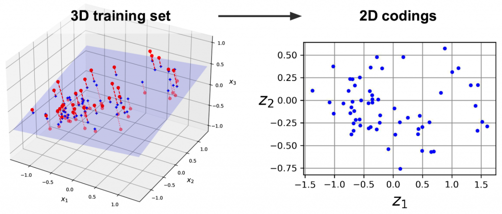 encoder和decoder都使用最基本的线性模型,不使用任何的激活函数。代价函数也使用基本的均方误差(MSE)。比如3D的数据集,经过PCA之后,encoder识别到了最佳的2D投射平面,从而将3D的数据集降维到2D空间内。