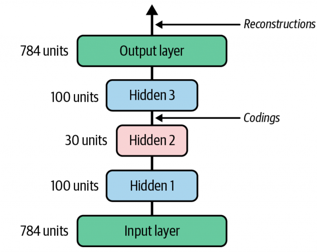 堆叠的自编码器,是一个相对于中心的隐藏层(codings layer)两边对称的架构。比如下图中,encoder会先
